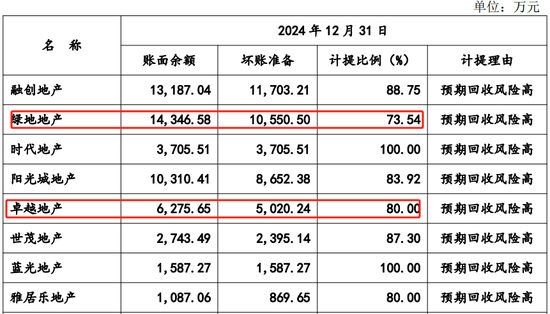 另外,对爆雷房企应收账款的计提一直是影响马可波罗净利润的重要因素,目前公司应收账款的风险是否完全出清仍值得关注。截至2022年至2024年各年度末,公司的坏账准备余额分别为 7.9亿元、10.49亿元、10.49亿元,2024年已经没有新增计提。2024年公司对多数房企的应收账款100%计提坏账准备,但有一小部分出险房企并非全额计提。