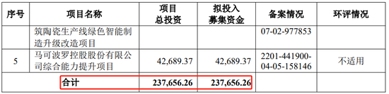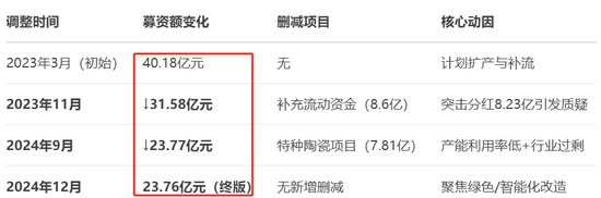 面对质疑马可波罗再次“能屈能伸”,在2024年10月又更新了一版招股说明书,把拟投资7.81亿元的这一主投项目也砍了。这样,公司的募集资金总额下降到了23.76亿元,较起初的40.18亿元,降幅超过四成。