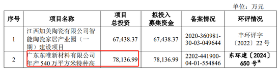 从募资投向看,马可波罗多数资金投入技改项目,什么绿色制造、智能制造、综合能力提升升级改造。但有两个是产能扩张项目,一是“江西加美陶瓷有限公司智能陶瓷家居产业园(一期)建设项目”(以下简称产业园项目),拟投入募集资金6.74亿元;二是“广东东唯新材料有限公司年产540万平方米特种高性能陶瓷板材项目”(以下简称特种陶瓷项目),拟投入募集资金7.81亿元,也是此次IPO融资的最大募投项目。