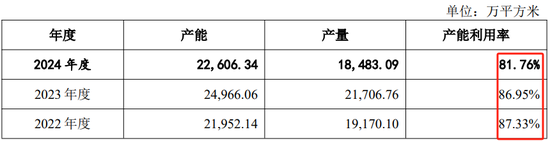 市场的低迷也体现在了马可波罗的产能利用率上。2022年到2024年,马可波罗的产能分别为2.2亿平方米、2.5亿平方米和2.26亿平方米,产量分别为1.92亿平方米、2.17亿平方米和1.85亿平方米,产能利用率分别为87.33%、86.95%和81.76%,产能利用率持续下降。值得注意的是2024年,马可波罗在产能缩减的情况下,产能利用率却骤降。