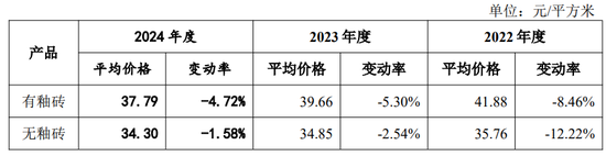 激烈竞争下,马可波罗的产品售价同样持续走低。2022年到2024年你,公司产品销售单价分别为41.62 元/平米、39.48元/平米和 37.72 元/平米,呈持续下降趋势。今年上半年,公司的产品销售单价继续下滑超过两个百分点。