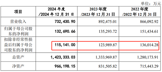 2021年到2024年,马可波罗营业收入分别为93.66亿元、86.61亿元、89.25亿元和73.24亿元,三年跌去22%;扣非净利润分别为14.6亿元、13.6亿元、12.4亿元和11.5亿元,拾阶而下,三年跌去约21%。